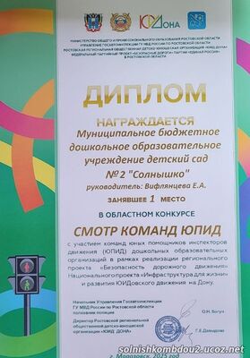 Команда ЮПИД "Детский патруль" награждена Грамотой за I место за участие в муниципальном этапе областного смотра готовности команд ЮПИД дошкольных образовательных организаций.